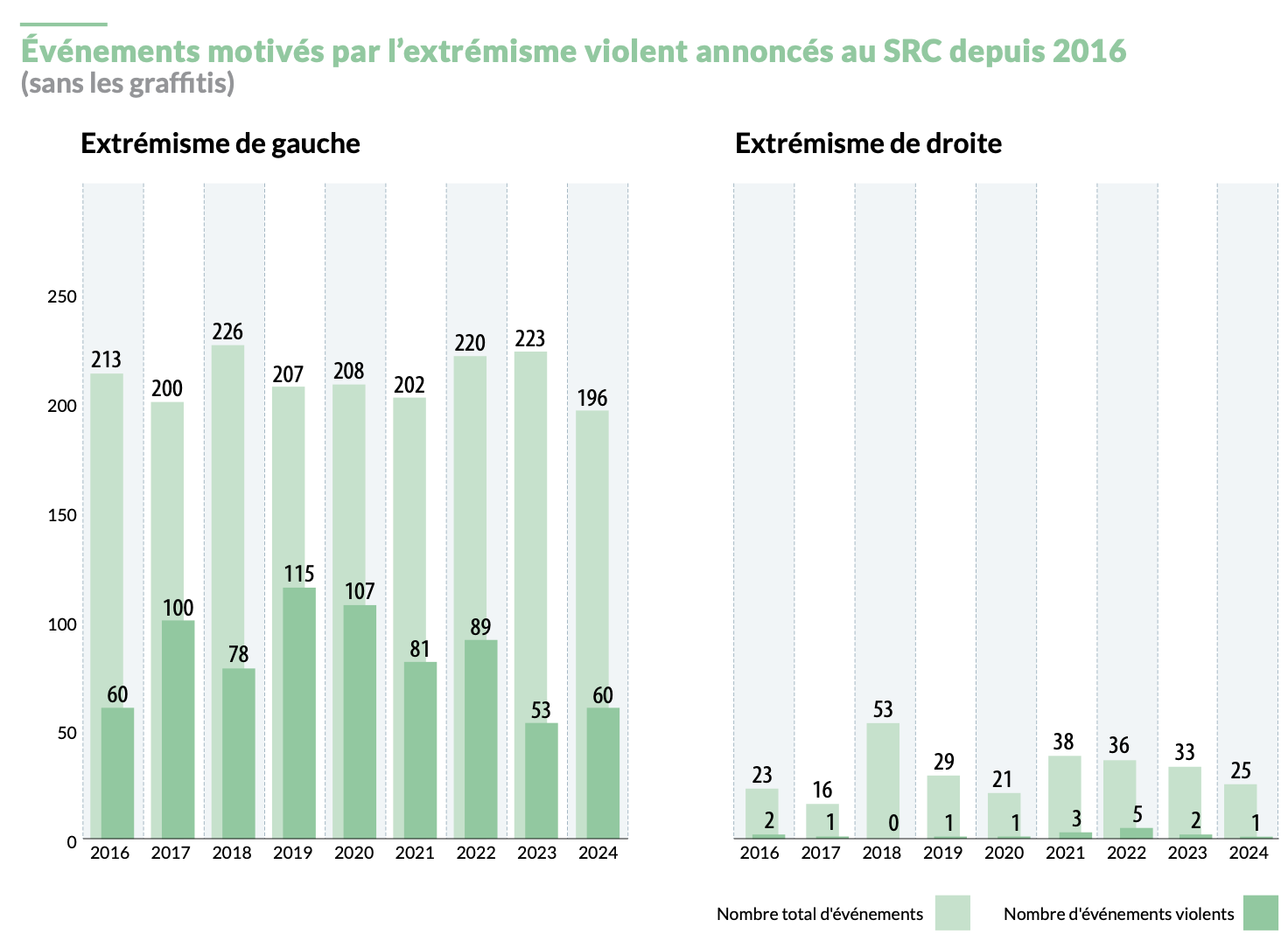 Les milieux gauchistes aiment propager l’idée d’une « extrême droite » prétendument omniprésente et dangereuse, qu’il faudrait combattre parce qu’elle serait particulièrement violente. Pourtant, l’observation de la réalité et les statistiques officielles (page 52) en Suisse démontrent l’inverse : les rapports annuels du SRC indiquent régulièrement que la violence politique provient majoritairement des milieux d’extrême gauche : attaques contre des personnes, dégradations de biens publics ou privés, ou encore intimidations visant des adversaires politiques.