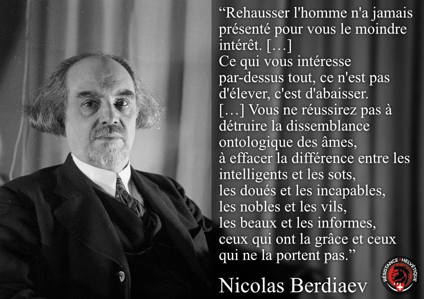 Rehausser l’homme n’a jamais présenté pour vous le moindre intérêt. Vous oubliez que l’on s’élève par la lutte et la libre sélection. Ce qui vous intéresse par-dessus tout, ce n’est pas d’élever, c’est d’abaisser. Le mystère de l’histoire vous est inaccessible, votre conscience y reste à jamais aveugle. Le mystère de l’histoire est un mystère aristocratique. Il s’accomplit par la minorité. Celle-ci porte l’esprit de l’universel, lequel est un esprit aristocratique. L’esprit de la majorité, celui de la démocratie, est provincial et particulariste. Dans l’histoire, ce sont la minorité et l’aristocratie qui dirigent. Se rebeller contre leur direction, c’est porter atteinte au mystère de l’histoire. Vous ne réussirez pas à détruire la dissemblance ontologique des âmes, à effacer la différence entre les intelligents et les sots, les doués et les incapables, les nobles et les vils, les beaux et les informes, ceux qui ont la grâce et ceux qui ne la portent pas.