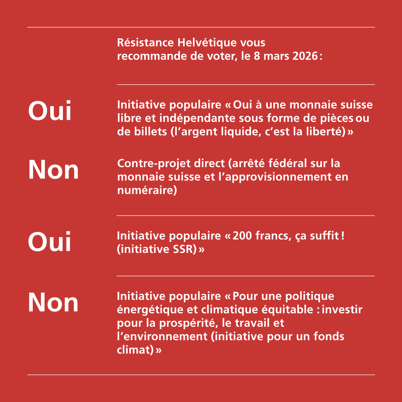 Recommandation de vote pour le 8 mars 2026 7 février 2026 - Publié par Rédacteurs RH - Classés dans :Recommandation de vote Partager :Cliquez pour partager sur Facebook(ouvre dans une nouvelle fenêtre)Cliquez pour partager sur Twitter(ouvre dans une nouvelle fenêtre)Cliquez pour partager sur WhatsApp(ouvre dans une nouvelle fenêtre)Cliquez pour partager sur Telegram(ouvre dans une nouvelle fenêtre)Cliquez pour envoyer par e-mail à un ami(ouvre dans une nouvelle fenêtre) Articles similaires Articles similaires :Recommandation de vote pour le 30 novembre 2025 Rendez la Suisse à nouveau géniale : votez bien le 22 octobre ! Alors qu'en Europe, de plus en plus de pays optent pour une politique de protection du peuple indigène et de ses valeurs, nos partis […]Consignes de vote de Résistance Helvétique pour le 18 juin 2023